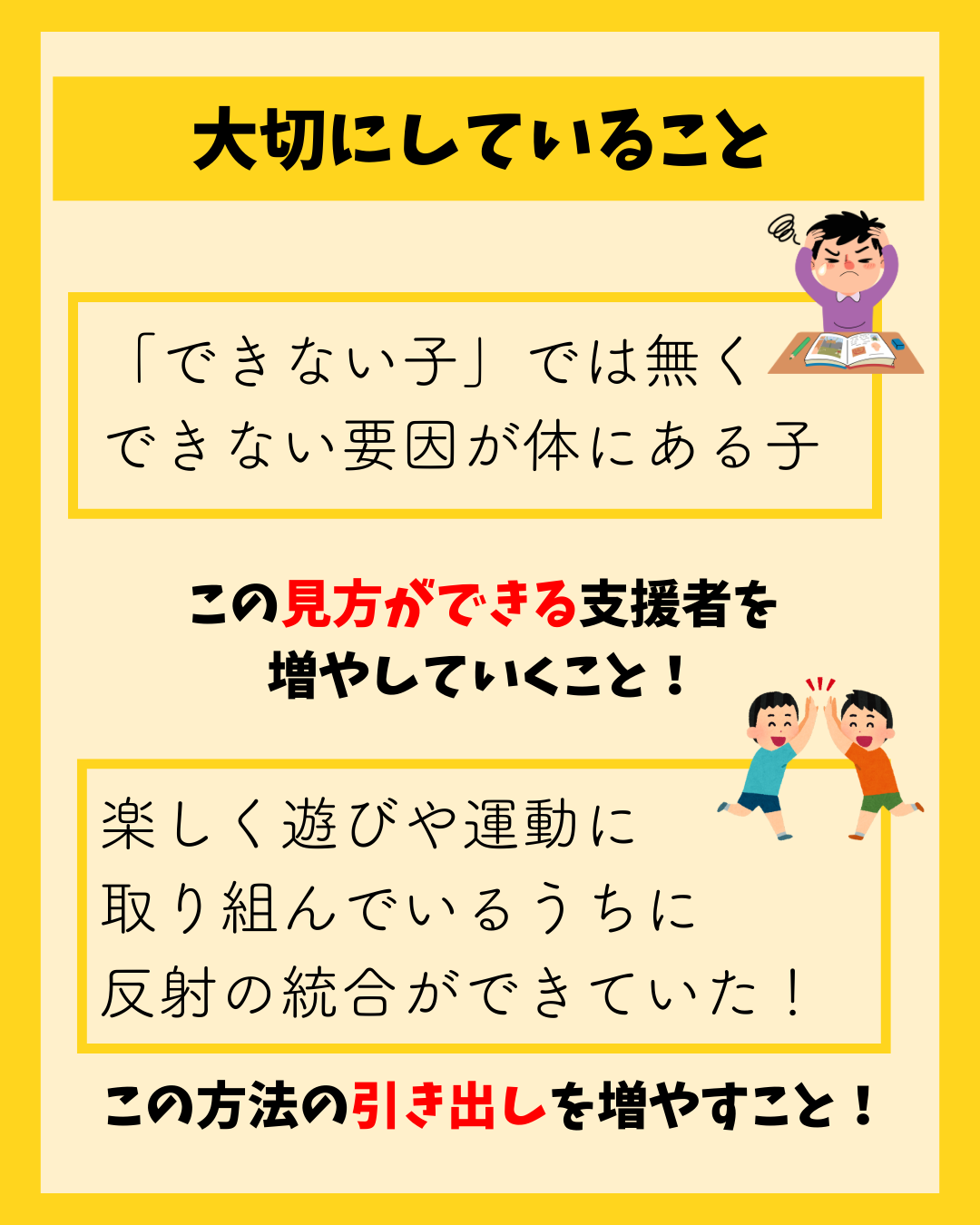 原始反射という言葉は知っていたが、実際何なのか理解できずにいたので、子供の行動の不思議から紐解いていけるものもあるのだと実感できました。子供の困りごとの原因が分かると、大人も子供も穏やかな時間が増えると希望を持てました!